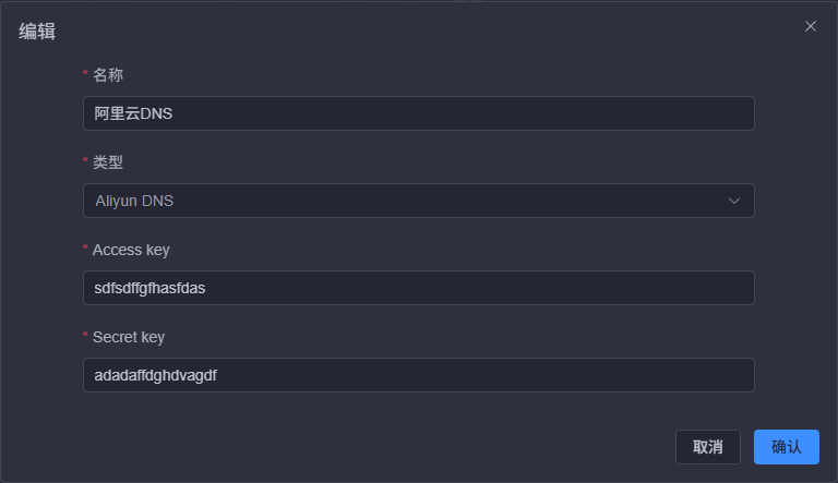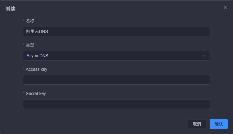 类型下拉选择Aliyun DNS,名称随便写,易于辨认即可。