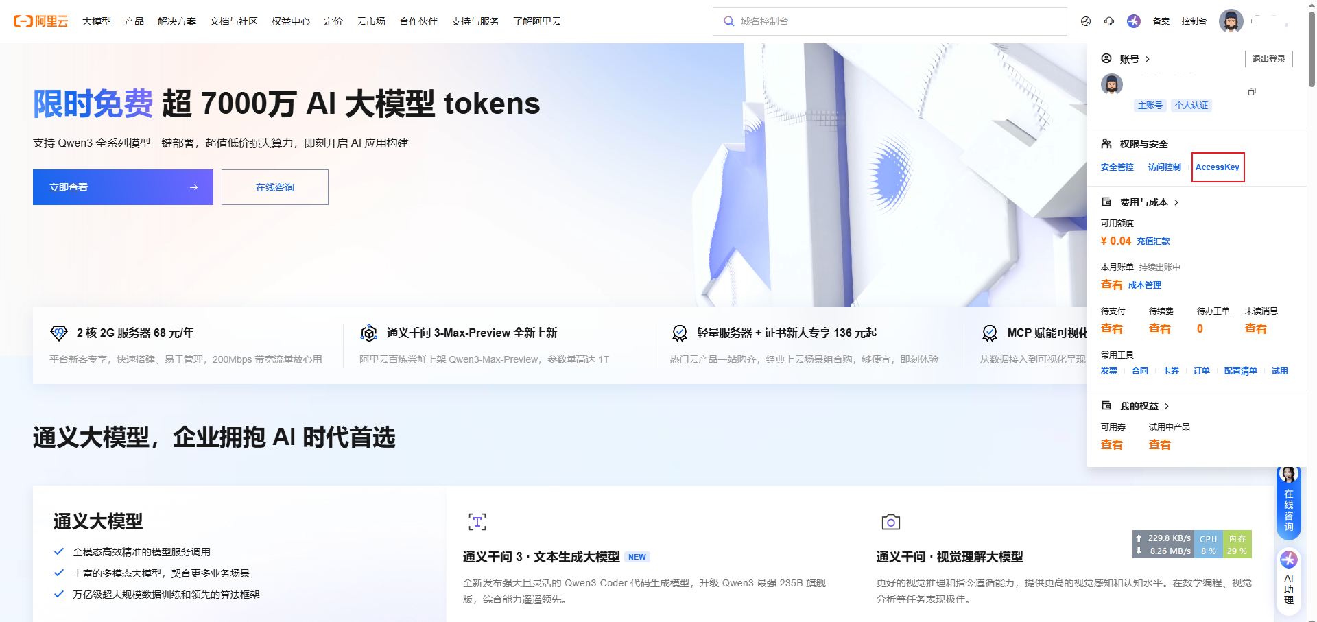 接下来我们登录阿里云,在右上角头像位置悬停,选择AccessKey: