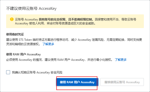 点击使用RAM用户AccessKey(上次还是1panel1.0时用的云AccessKey,不知道什么原因怎么都申请不下来)