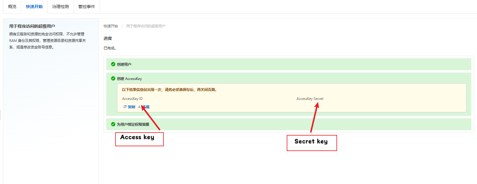 验证完成后会显现AccessKey信息,此信息仅出现一次