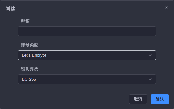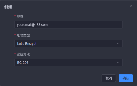 其他选项保持不变,点击确认,Acme 账户创建完成