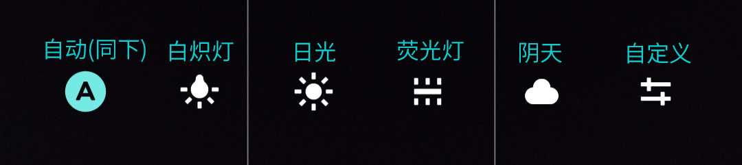 白平衡WB:包含自动、预设项【白炽灯、日光、荧光灯、阴天】和用户自定义(可设置色温区间为2000-8000K)