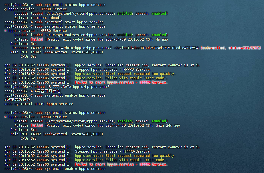 #这段注释不用复制 设置开机自启和现在启动服务本来是一起复制到shell的,但armv7的系统太卡了,建议还是一句一句的复制比较好Created symlink /etc/systemd/system/multi-user.target.wants/hppro.service → /etc/systemd/system/hppro.service.