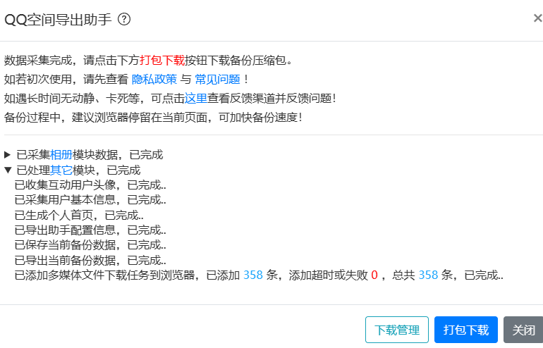除相册外,还可以备份说说、日志、访客、留言等功能,只需勾选准备备份的数据,然后等待采集完成,即可将数据握在自己手中